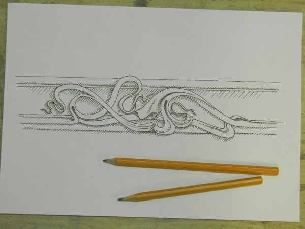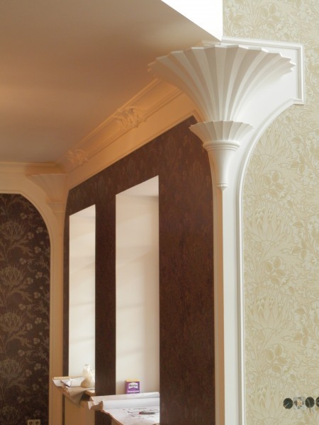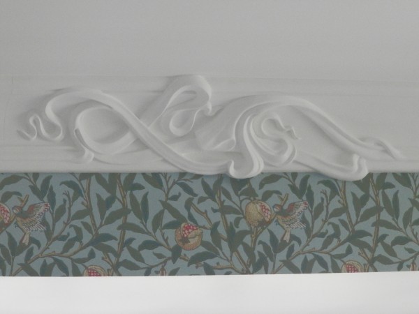 Один из наших любимых завершенных объектов. Дом оформлен в стиле модерн. Непосредственно, что касается гипса: от нас туда потребовалось огромное количество гладкотянутых карнизов и профилей, однако были и оригинальные художественные детали. Эскиз одной из деталей: В пластилине В гипсе, на своем законном месте